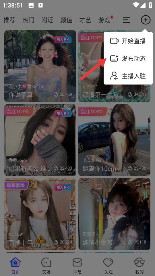 1、首頁布局清晰推薦熱門等標簽分類展示主播內容,右上角加號可快速開啟直播、發布動態或申請主播入駐,多樣入口滿足用戶互動與創作需求。