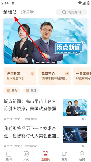 3、進入觀察員板塊,可查看編輯部、觀課堂等內容,有飯點新聞、觀網評論等欄目,獲取各類新聞評論和解析,拓展資訊視野。