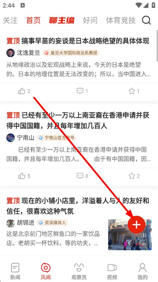 2、進入風聞板塊,可查看關注、首頁等內容,還有聊主編、問好等分類,可參與互動,發布內容,豐富資訊獲取和交流體驗。