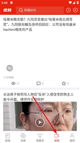 4、進入視頻板塊,可搜索視頻內容,查看各類新聞視頻的發布時間、瀏覽量、評論數和收藏數,通過視頻形式獲取資訊。