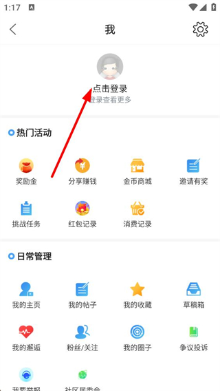 2、我的頁面點擊登錄可使用更多功能,頁面包含熱門活動日常管理等板塊,能參與獎勵金任務管理我的帖子收藏等內容。