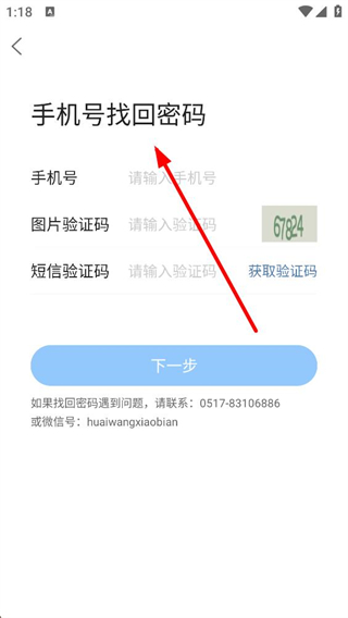 4、手機號找回密碼頁面需輸入手機號,填寫圖片及短信驗證碼,點擊下一步完成驗證,若遇問題可聯系平臺提供的聯系方式咨詢。