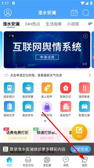 1、進入首頁可瀏覽本地相關服務入口,包含淮安振興淮揚美食等板塊,還能查看廣告及天氣提示,底部導航可切換至社區論壇等功能頁面。