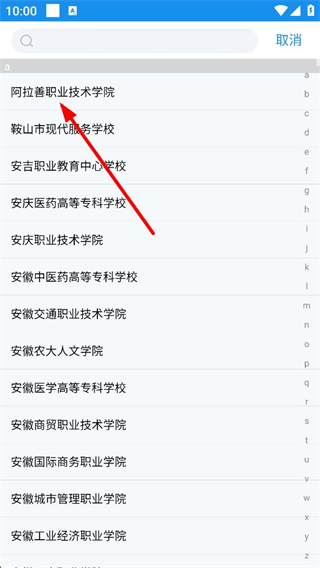 2、選擇學校時會進入學校列表頁面,列表展示了職業技術學院等多所院校,可直接瀏覽查找或通過搜索定位目標學校,選中后返回登錄頁繼續操作。