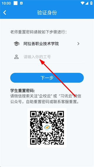 4、進入驗證身份頁面后,老師重置密碼需選定學校并輸入工號再點擊下一步,學生重置密碼則可關注企校云或習訊云公眾號自助操作,也可聯系客服協助處理。