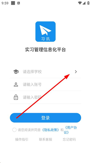 1、進入習訊實習管理信息化平臺的登錄頁,先點擊請選擇學校區域選定所屬院校,再依次輸入賬號和密碼,勾選隱私政策與用戶協議后點擊登錄,推進登錄流程。