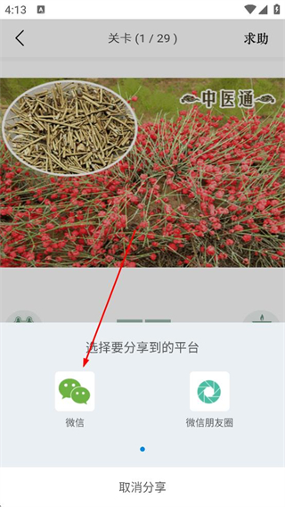 4、在答題界面找到幫助點擊后選擇微信等平臺,可將該中藥題目分享給對應平臺的好友。