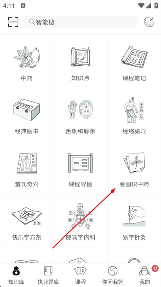 1、打開中醫通軟件,進入知識庫頁面,瀏覽功能分類,選擇看圖識中藥選項,進入對應的學習模塊頁面。