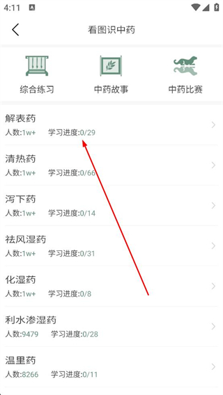 2、在看圖識中藥頁面選擇解表藥分類,點擊進入該分類的關卡列表,查看學習進度并選擇關卡1開始練習。