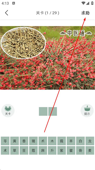 3、進入關卡1的答題界面查看中藥圖片,根據提示從下方選項中選擇對應的中藥名稱,完成答題,還可以點擊幫助按鈕。