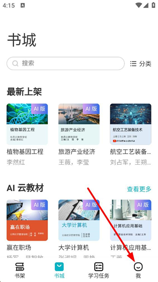 1、進入應用后呈現書城界面,可查看最新上架書籍與云教材等內容,點擊底部我按鈕,進入后續的賬號相關操作頁面。