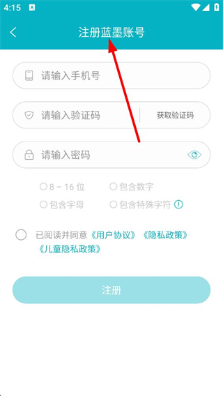 3、進入注冊藍墨賬號界面,需填寫手機號、獲取并輸入驗證碼、設置符合要求的密碼,勾選協議后點擊注冊完成賬號創建。