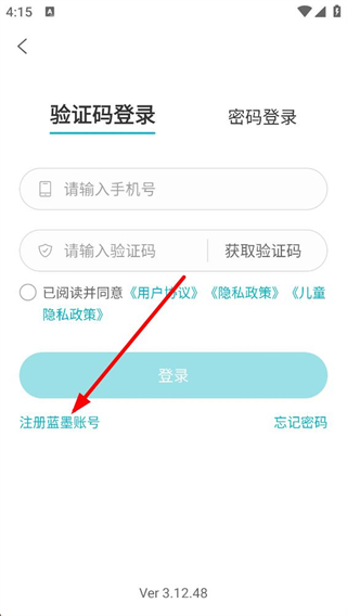 2、進入對應頁面后呈現驗證碼登錄界面,可輸入手機號與驗證碼登錄,也能點擊注冊藍墨賬號,進入賬號注冊的相關流程。