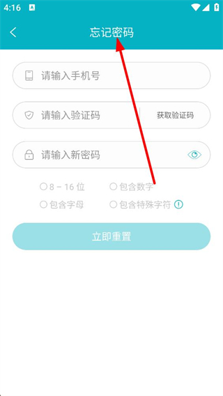 4、若忘記密碼進入對應界面,輸入手機號、獲取并填寫驗證碼,設置新密碼,之后點擊立即重置,完成密碼的重新設置操作。