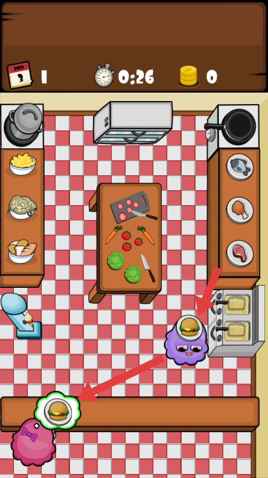 3、然后將制作好的食物端給顧客,滿足顧客的需求,獲得相應的金幣獎勵,準備收拾盤子。