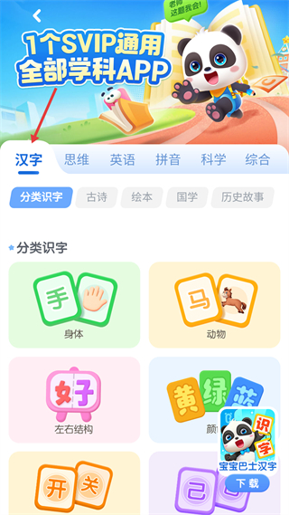 1、漢字模塊頁,以分類識字為核心,涵蓋身體動物等主題,結合漢字結構等知識點,用圖文關聯輔助識字,還提供獨立APP下載。