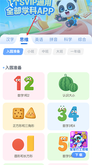 2、思維模塊頁,面向入園準備階段兒童,設數字認知等內容,以趣味形象呈現知識,適配低齡兒童思維啟蒙的認知特點。