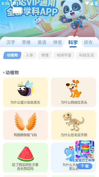 3、科學模塊頁,圍繞動植物等主題,以為什么類問題引導,解答科學常識,幫助兒童了解自然現象,培養探索興趣。