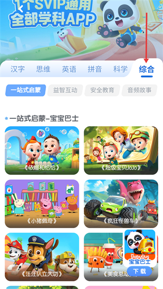 4、綜合模塊頁,提供一站式啟蒙內容,含動畫IP資源,覆蓋益智互動等維度,整合多類兒童內容,實現啟蒙一站式覆蓋。