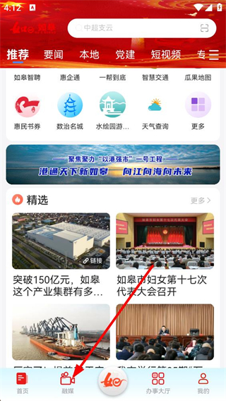 1、進入應用首頁可瀏覽推薦資訊與各類功能入口,點擊底部融媒選項,進入融媒板塊界面,查看直播、回看等內容。