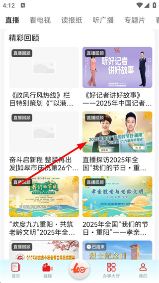 2、融媒界面可選擇直播、看電視等分類,查看精彩回顧中的直播回放內容,點擊對應回放條目進入詳情播放頁。