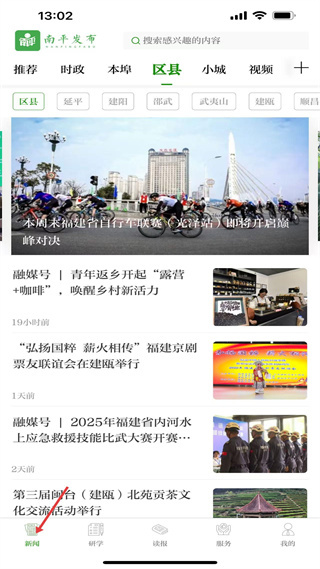 1、新聞板塊區縣欄目,發布福建省自行車聯賽、青年返鄉露營咖啡、福建京劇票友聯誼會等新聞,傳遞本地賽事與文化動態。