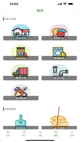 3、服務板塊含圈子交流和閩北服務,圈子交流有買房賣房、同城交友等功能,閩北服務有閩北家政等,方便市民生活服務。