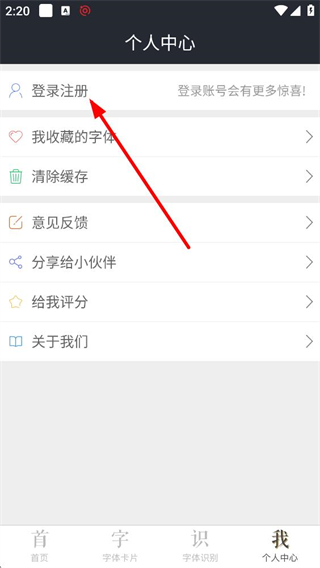 2、點擊首頁底部的個人中心選項,進入個人中心界面,可進行登錄注冊操作,還能管理我收藏的字體、清除緩存、提交意見反饋,使用各類個人相關功能。