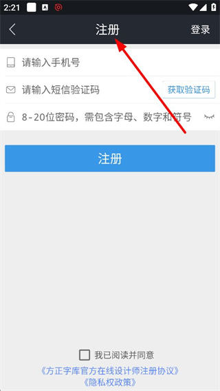 4、點擊登錄頁面的注冊選項,進入注冊界面,需輸入手機號、獲取并填寫短信驗證碼,設置含字母數字符號的密碼,勾選協議后完成賬號注冊。