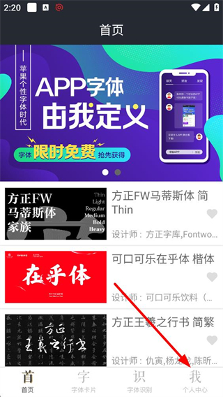 1、進入APP首頁,可看到APP字體由我定義的宣傳內容,還有方正FW馬蒂斯體、可口可樂乎體等字體展示,能瀏覽各類字體資源,了解不同字體的設計風格及作者相關信息。