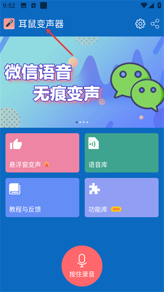 1、首頁含懸浮窗變聲語音庫等核心入口,支持按住錄音操作,主打微信語音無痕變聲功能,是應用的功能總覽頁面。