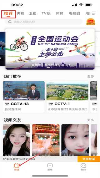 1、頻道板塊有推薦、央視等分類,展示熱門央視頻道及視頻交友內容,用戶可瀏覽選擇各類頻道觀看。
