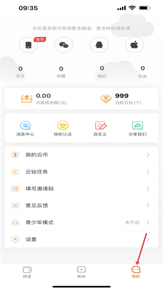 4、我的板塊可手機登錄,有關注等功能入口,還有可提現余額、云鉆等信息,用戶可管理賬號及參與任務。