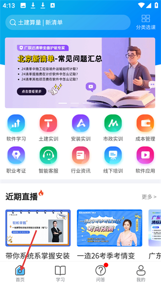 2、首頁,含軟件學習等功能入口,展示近期直播課程,是建筑行業學習與資訊獲取的核心展示平臺。