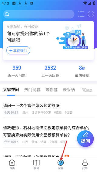 3、問答頁,可向專家提問,展示熱門問題及回復數據,是建筑行業專業問題咨詢的互動模塊。
