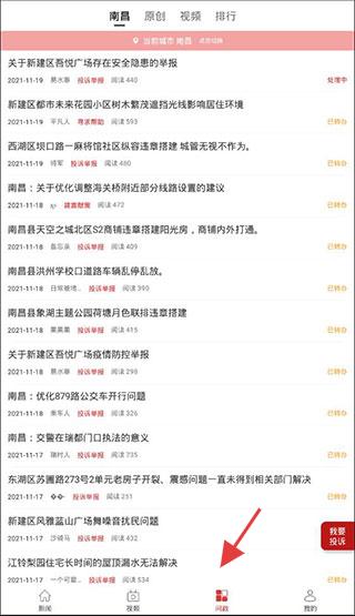 3、點擊問政板塊,呈現原創、視頻、排行等分類,有關于新建區吾悅廣場安全隱患舉報等市民反饋信息。