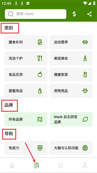 2、分類頁,有膳食補劑、運動營養等多類別,還有品牌和導購板塊,方便用戶按分類或品牌查找健康產品。