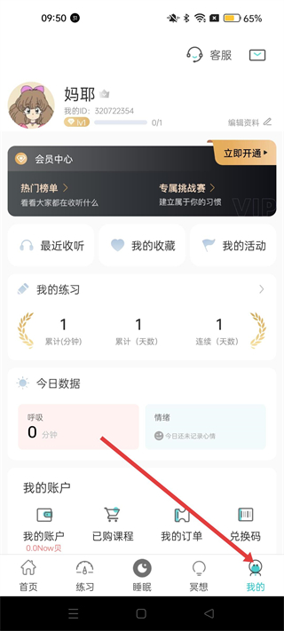 2、點擊我的選項,進入個人界面,可查看會員中心、最近收聽、我的收藏等內容,還有累計練習數據和今日數據,以及我的賬戶相關功能,如已購課程、我的訂單等。