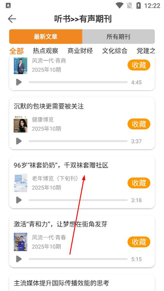 3、在有聲期刊列表中選擇一篇如96歲襪套奶奶,千雙襪套贈社區的內容,點擊進入其詳情頁面。