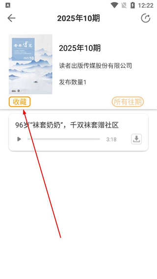 4、在該內容的詳情頁查看發布信息及音頻時長,點擊收藏按鈕,將這篇有聲期刊內容收藏以便后續收聽。