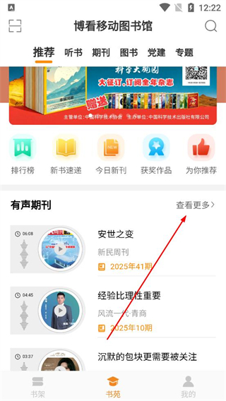 2、登錄后進入博看移動圖書館首頁,找到有聲期刊板塊,點擊查看更多按鈕,進入有聲期刊的列表頁面。