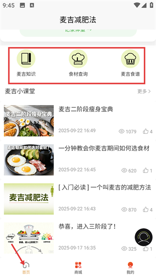 1、首頁設麥吉知識、食材查詢、麥吉食譜工具,含麥吉小課堂板塊,展示減肥階段指導、食材選擇等基礎內容。