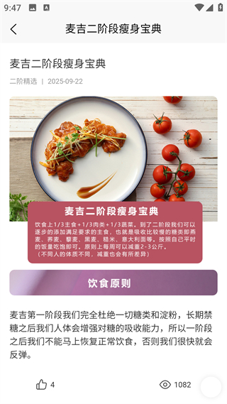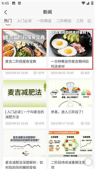 2、資訊頁按熱門、階段精選等分類展示內容,含二階段瘦身寶典、食材選擇指南等帖子,可按需篩選對應階段的減肥指導。