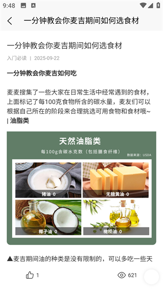 4、食材選擇指南標注常見食材碳水含量,以油脂類為例說明可選食材,幫助用戶根據所處階段合理挑選麥吉期間的食物。