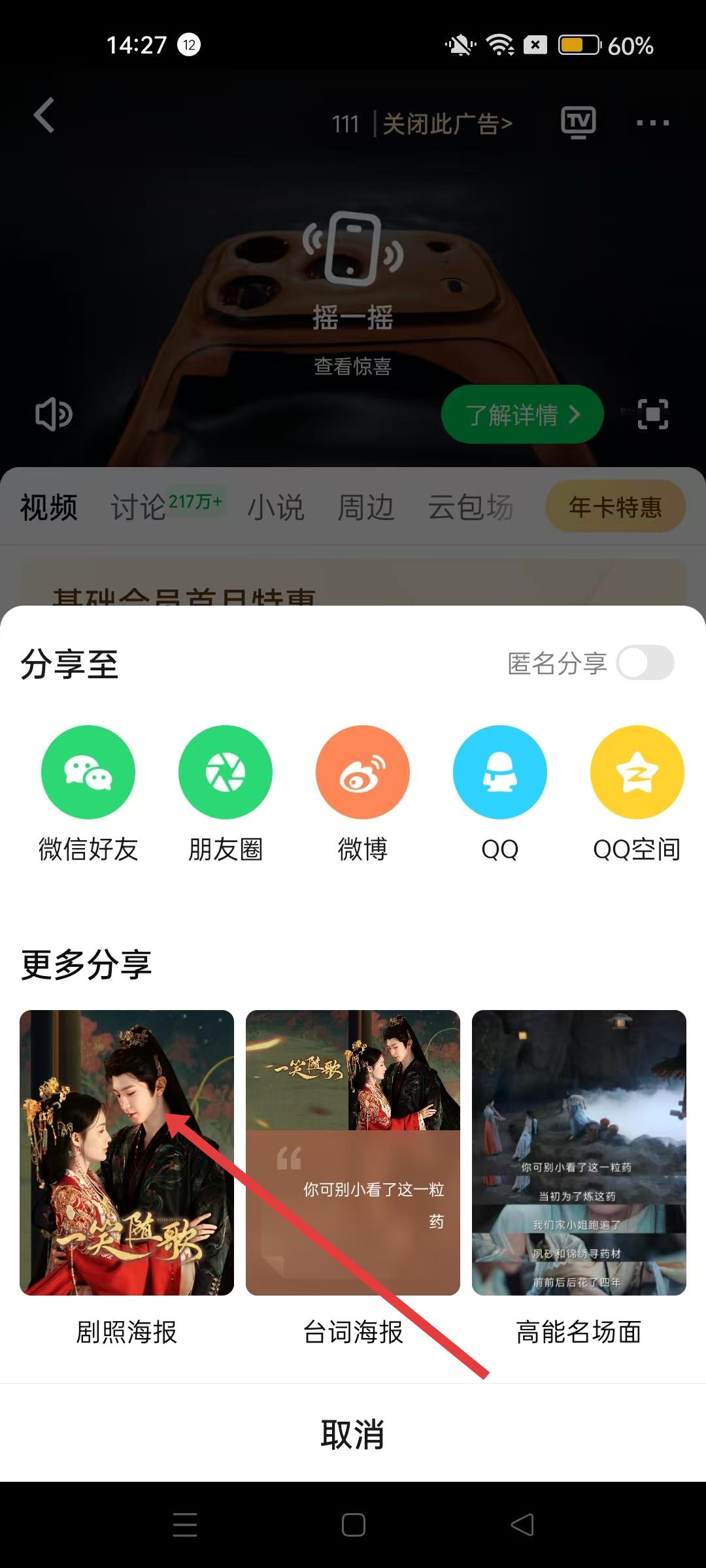 4、分享選項列表中,除了選擇社交平臺分享,還可選擇劇照海報、臺詞海報、高能名場面等形式進行分享,滿足不同分享需求。