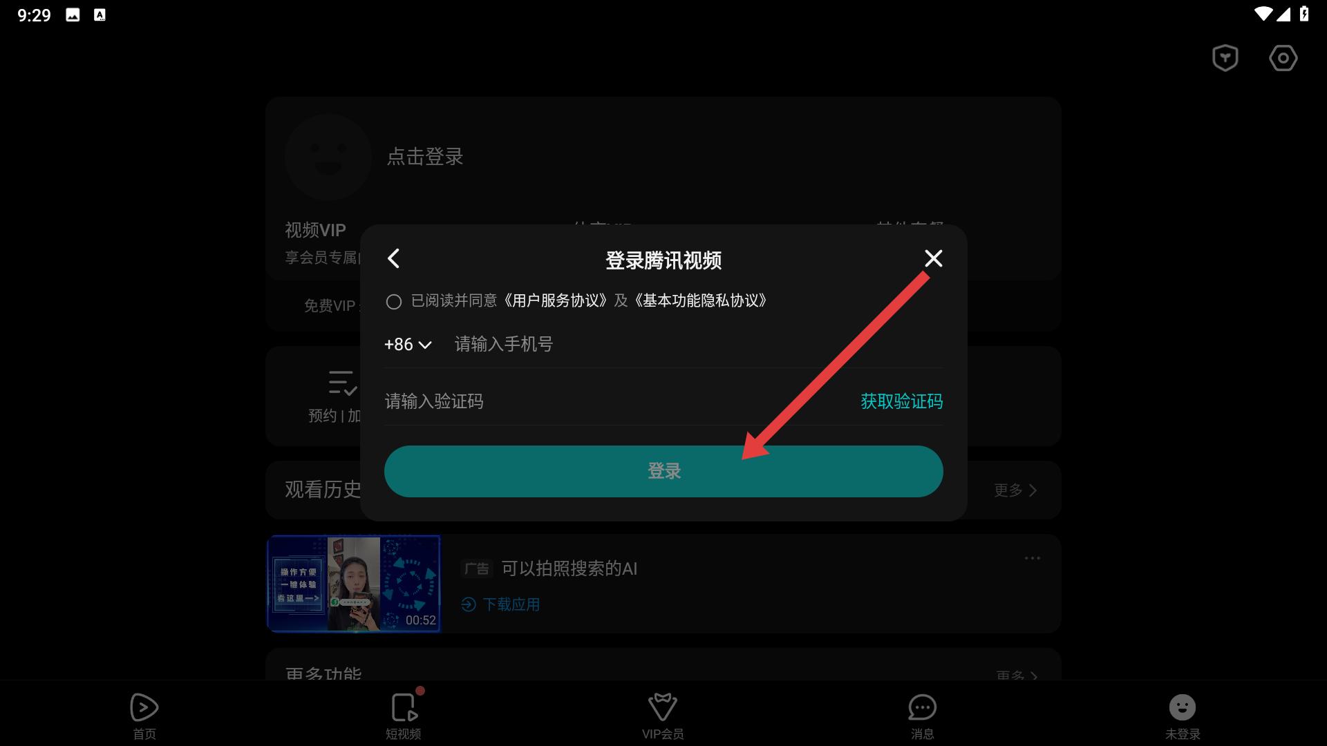 4、手機號登錄界面,輸入手機號和獲取的驗證碼,然后點擊登錄按鈕,完成騰訊視頻的登錄。