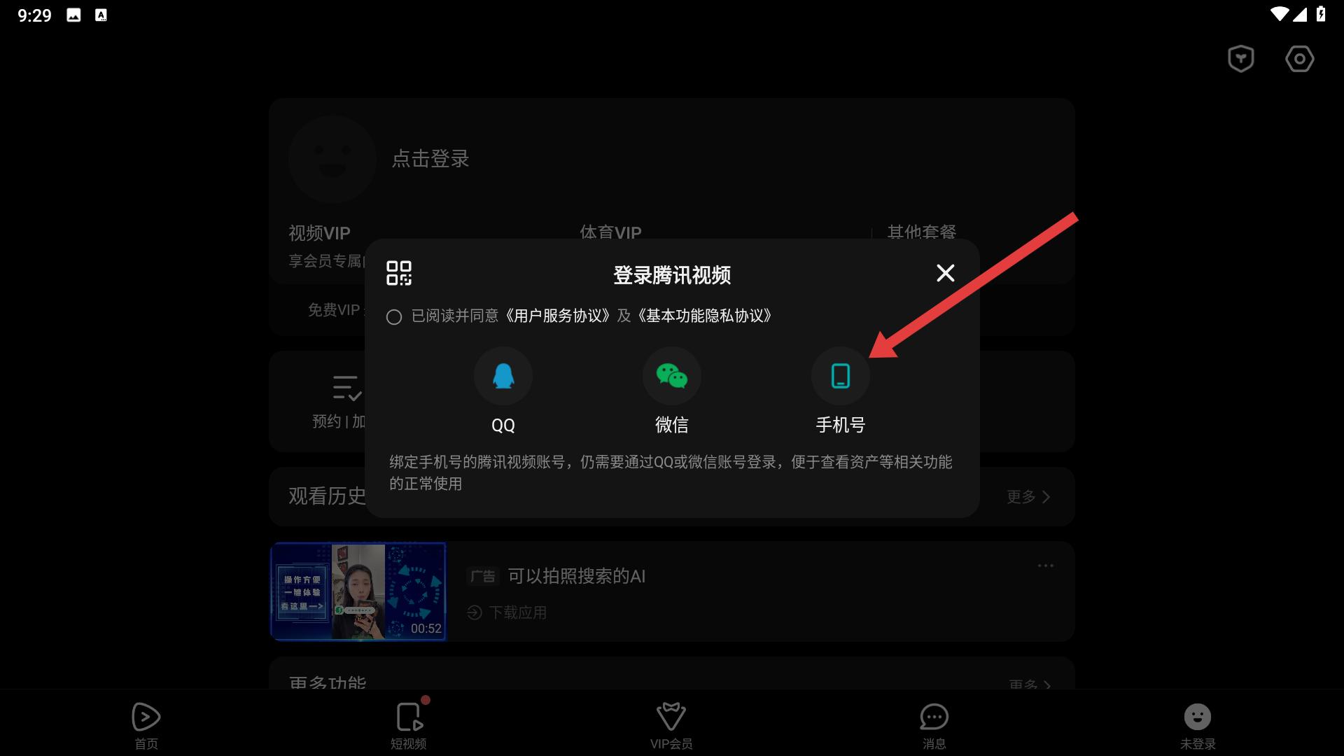 3、登錄騰訊視頻的彈窗中,選擇手機號登錄方式,進入手機號登錄的具體界面。