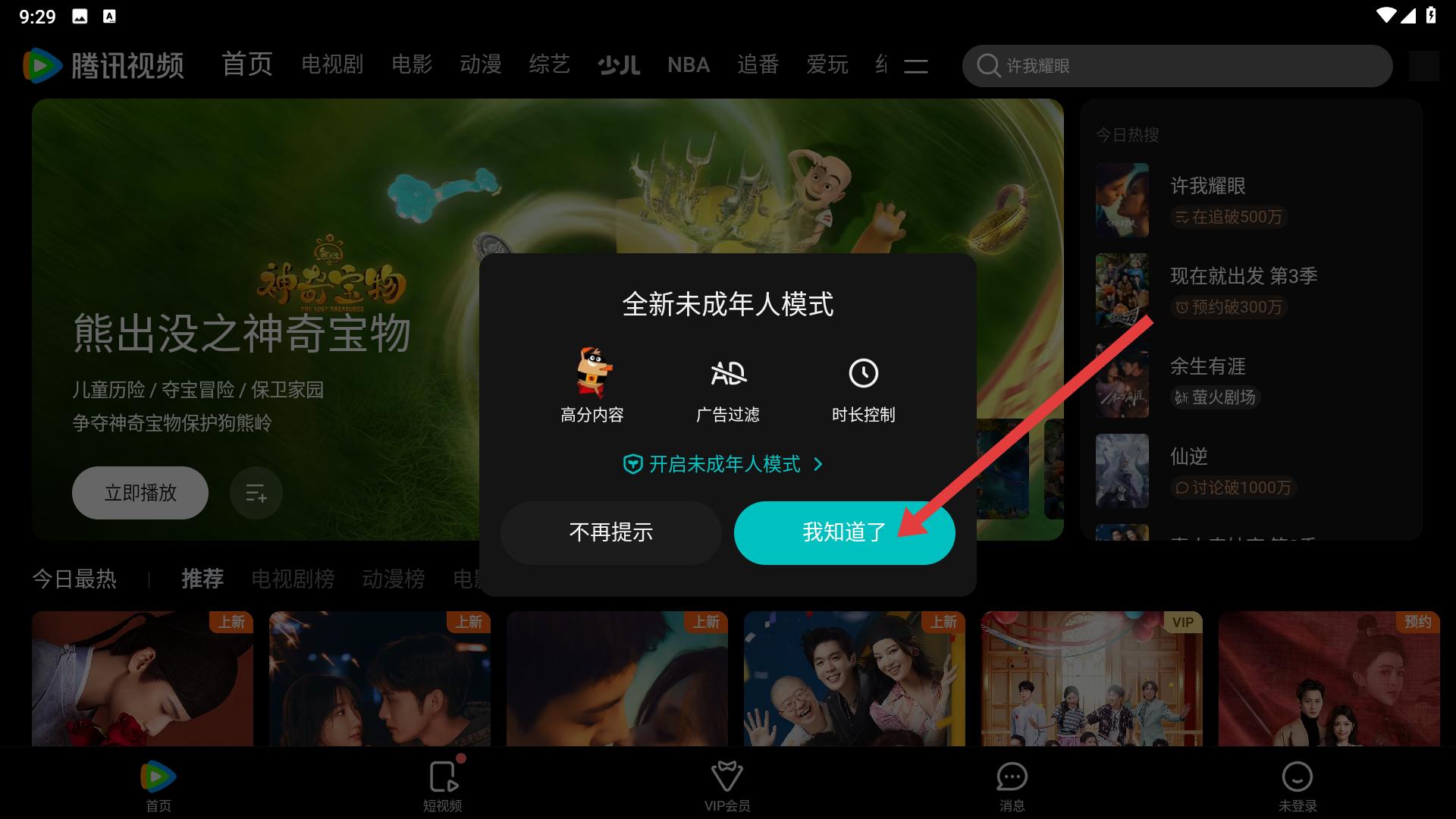 1、打開騰訊視頻,若彈出未成年人模式提示框,可點擊我知道了,了解相關模式后繼續操作。
