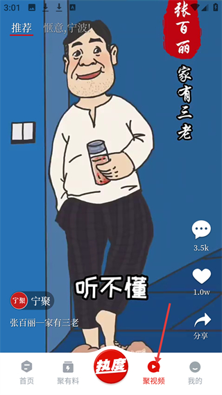 3、聚視頻板塊展示家有三老等原創視頻,用戶可觀看本地特色短視頻,還能點贊評論分享互動。