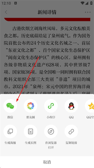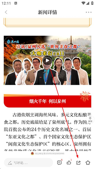 3、點擊美食相關內容進入新聞詳情頁,閱讀頁面展示的泉州入選世界美食之都的資訊,點擊下方的分享按鈕。